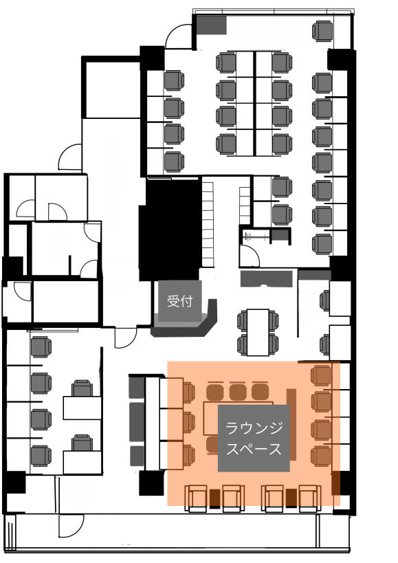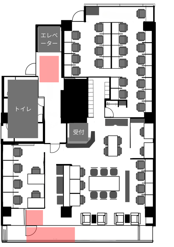 長時間(10分以上)の発声行為は、他のご利用者様にご迷惑をおかけしますので、エレベーター前もしくはテラス席でお願いいたします。(赤いエリア)